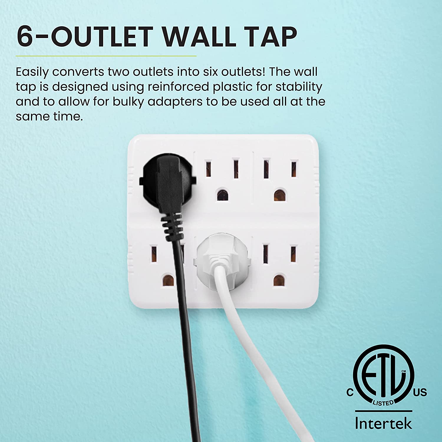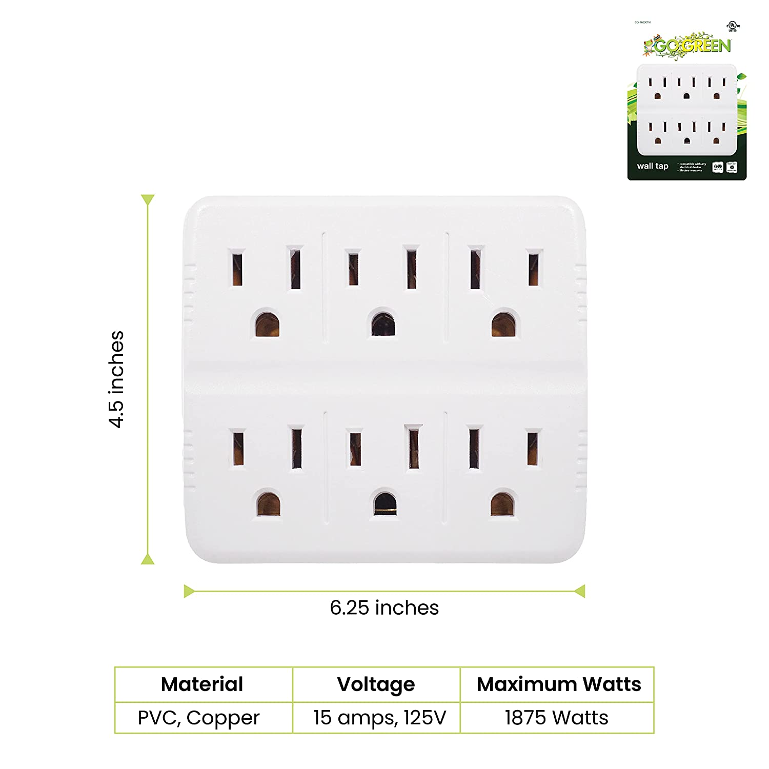 El grifo de pared de 6 salidas GoGreen Power® le permite convertir rápidamente dos salidas en seis salidas. El grifo de pared se diseñó con plástico reforzado para brindar estabilidad y permitir el uso de adaptadores voluminosos al mismo tiempo. Cada tomacorriente está conectado a tierra y la unidad está certificada por UL para cumplir con todos los estándares de la industria. El grifo de pared es el artículo ideal para tener en casa, la oficina y el garaje.