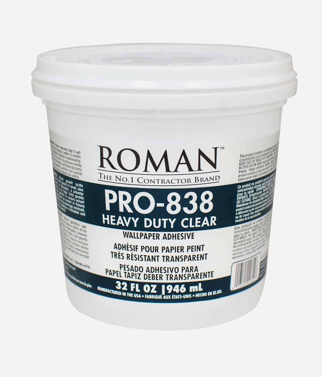 PRO-838 Heavy Duty Clear is a commercial grade wallcovering adhesive designed for contractors. PRO-838 provides excellent adhesion and can be used to install medium-weight to heavyweight wallcoverings.