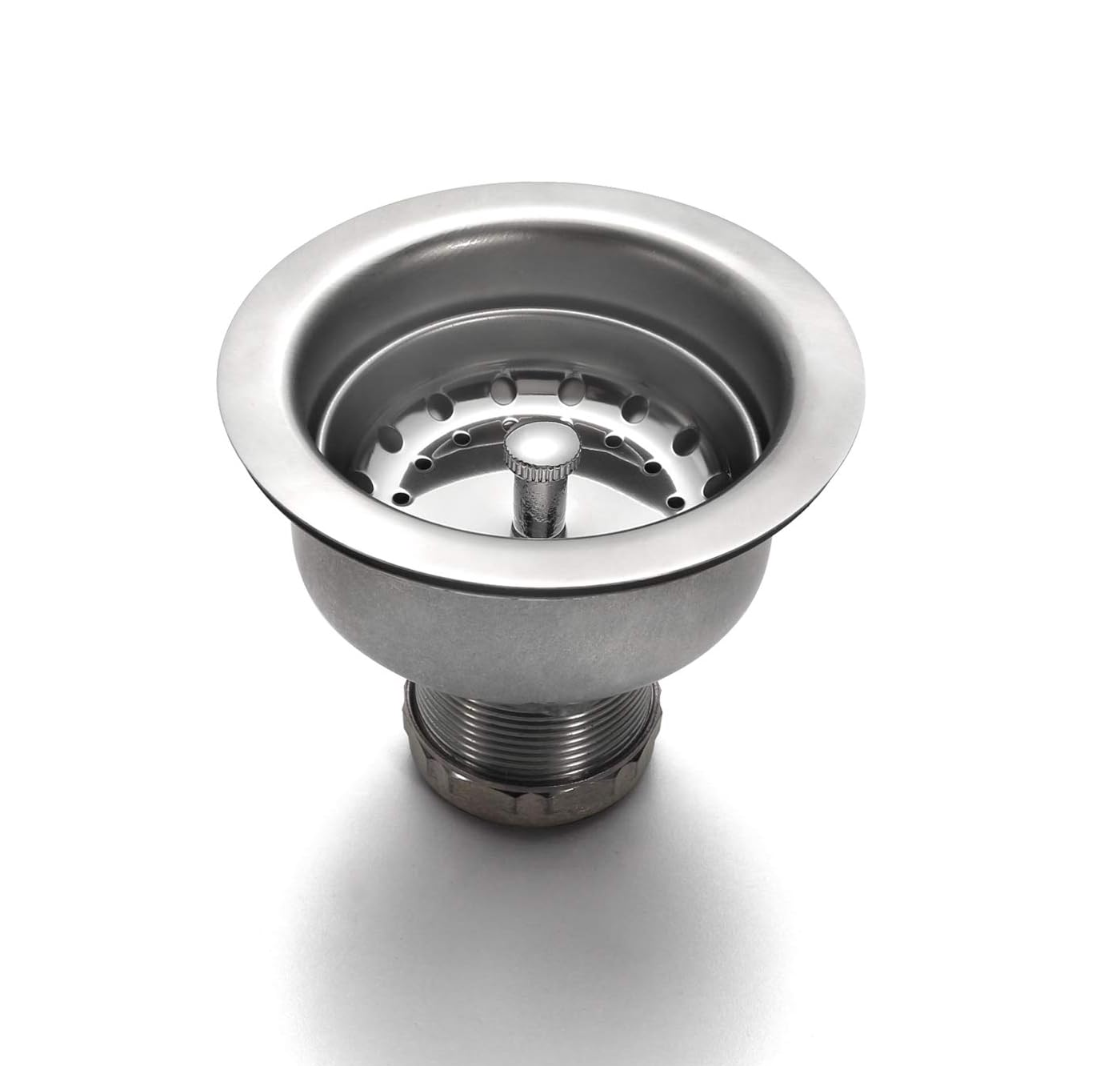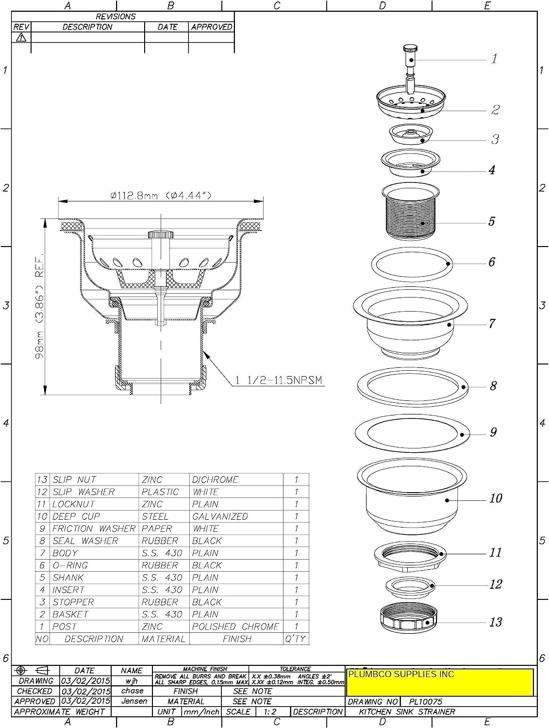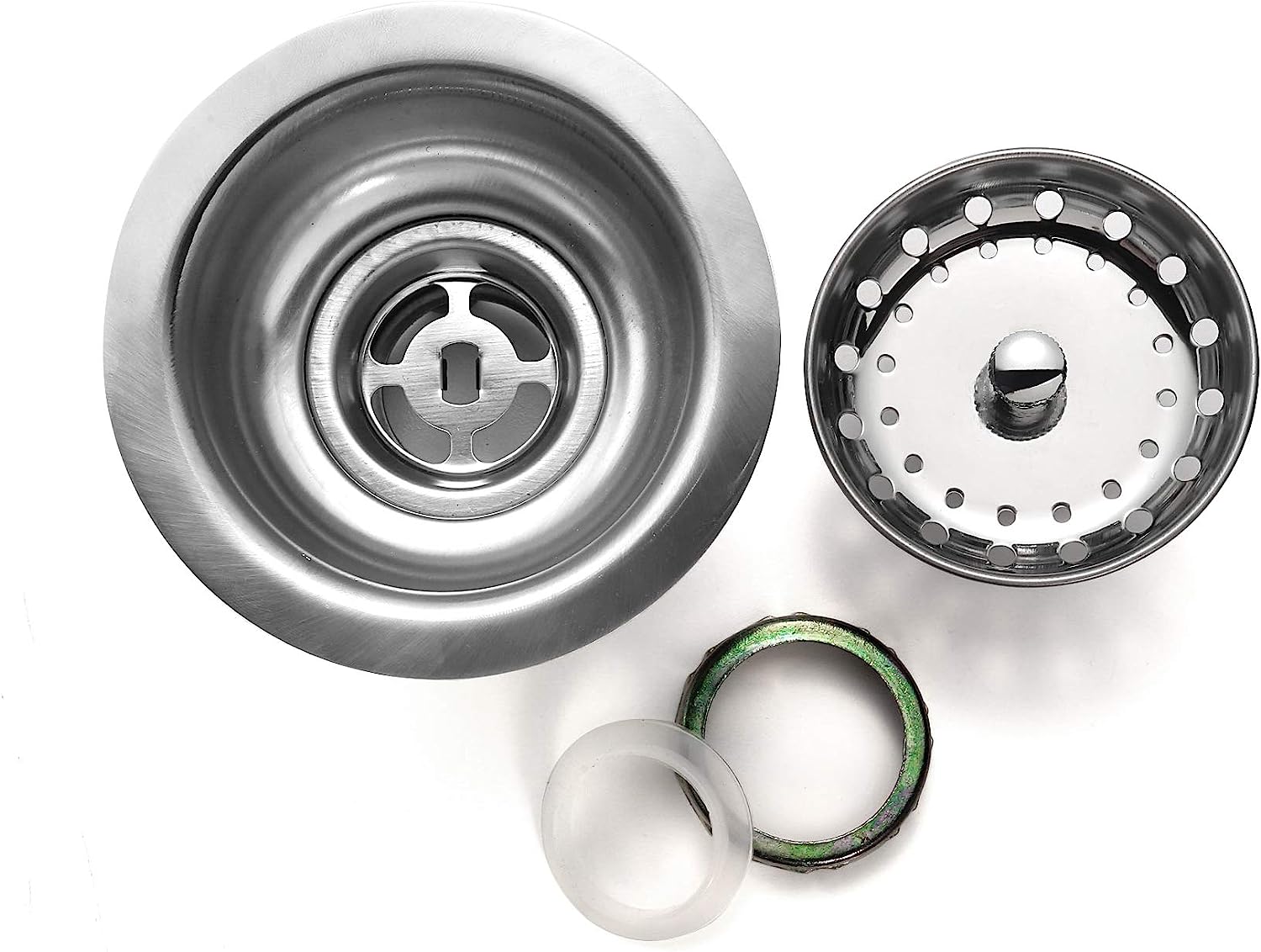 Este colador para fregadero cuenta con una cesta de acero inoxidable con un tope de goma de borde enrollado, tuerca deslizante, cola roscada de latón cromado con tuerca de seguridad de zinc de 1-1/2" para una fácil instalación, carcasa de bloqueo de acero galvanizado con goma pesada de 3-3/8" arandela, ideal para fregaderos de hierro fundido, se adapta a aberturas de 3-1/2" a 4" de diámetro.