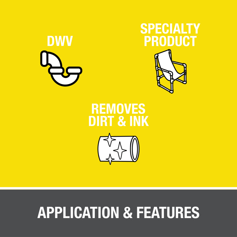 - Fast-acting cleaner for ABS, PVC and CPVC pipe and fittings
