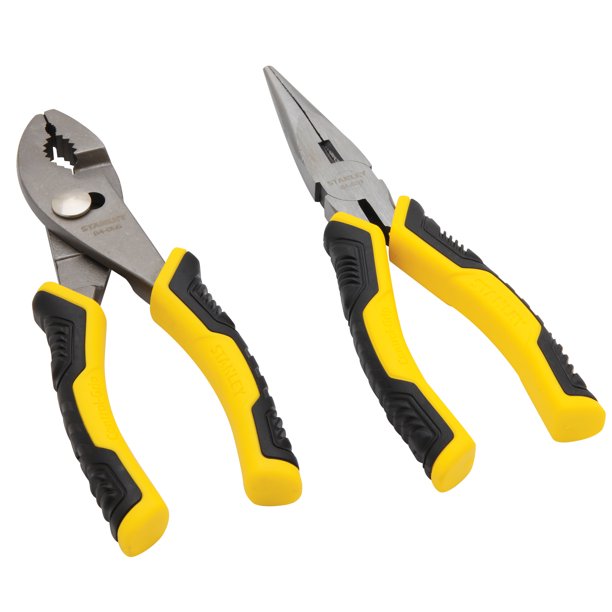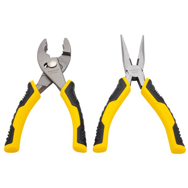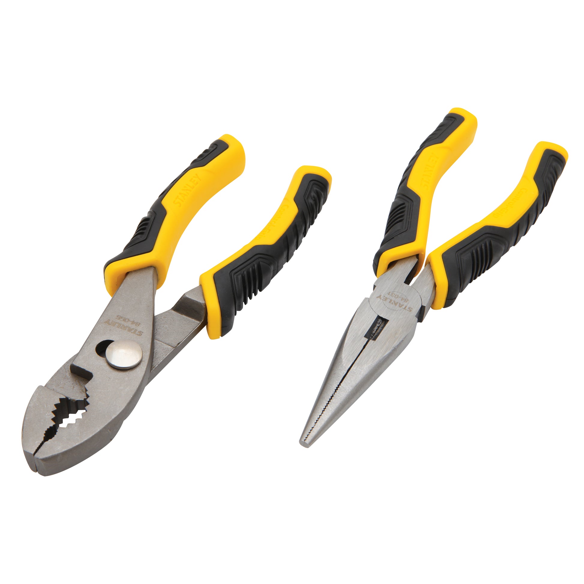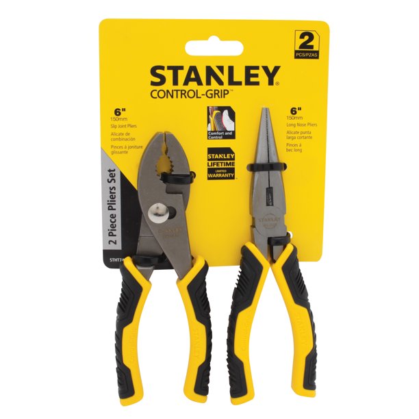 The Stanley 6 inch control grip plier set features drop forged steel for strength and durability, along with molded bi-material grips for comfort and control. Set includes a 6-inch long nose pliers (84-031); fixed joint design for bending, turning, and cutting. The long nose is designed for use in tight spaces. It also includes a 6-inch slip joint pliers (84-055); two-position, adjustable joint pliers for grasping and turning. Meets ANSI specifications, and backed by a limited lifetime warranty.