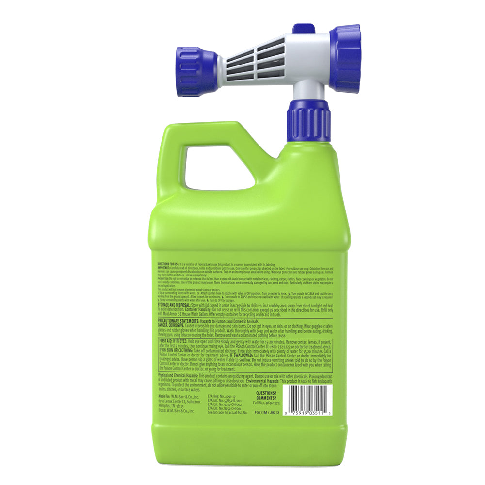 Clean up the outside of your home fast with Mold Armor E-Z House Wash. This exterior house cleaner blasts away dirt, mold and algae stains, leaving your siding looking bright and new in minutes – no ladder or scrubbing required. Powerful cleaning action kills mold and mildew down to the roots. Microban® foaming technology lifts away dirt & debris and clings to surfaces for a long-lasting clean. Safe for use on vinyl, brick, stucco, aluminum, concrete and more. Directions for use: 1) Spray surrounding plants with water. 2) Attach garden hose to nozzle with valve in OFF position. Turn on water to hose. 3) Turn nozzle to CLEAN and coat the area, working from the ground upward. 4) Wait 10 minutes while the solution works. 5) Turn nozzle to RINSE and rinse area well with water. If staining persists, a second coat may be required. 6) Rinse surrounding plants with water. 7) Turn nozzle to OFF for storage. Wear eye protection and rubber gloves during use. Keep out of reach of children.