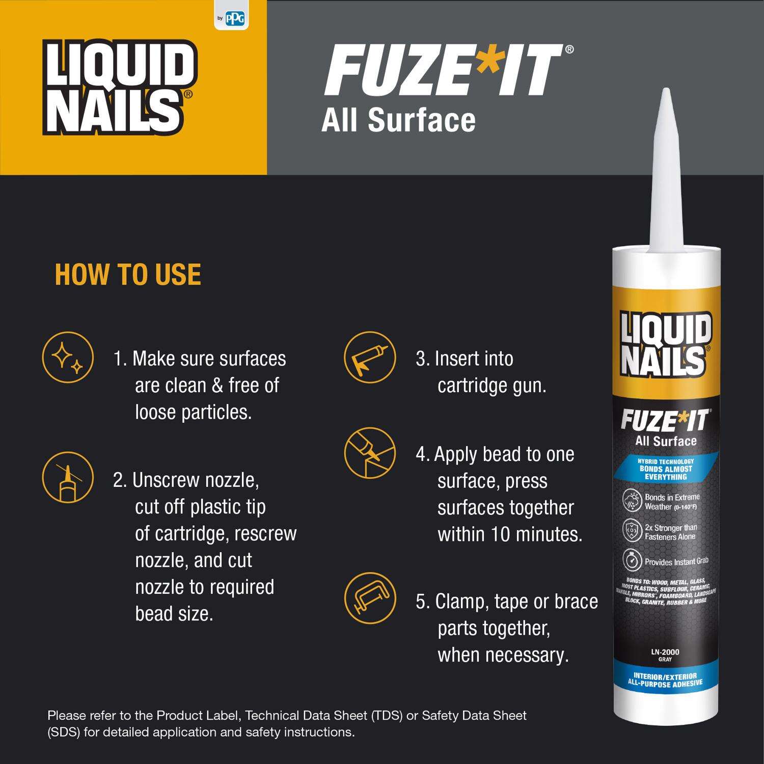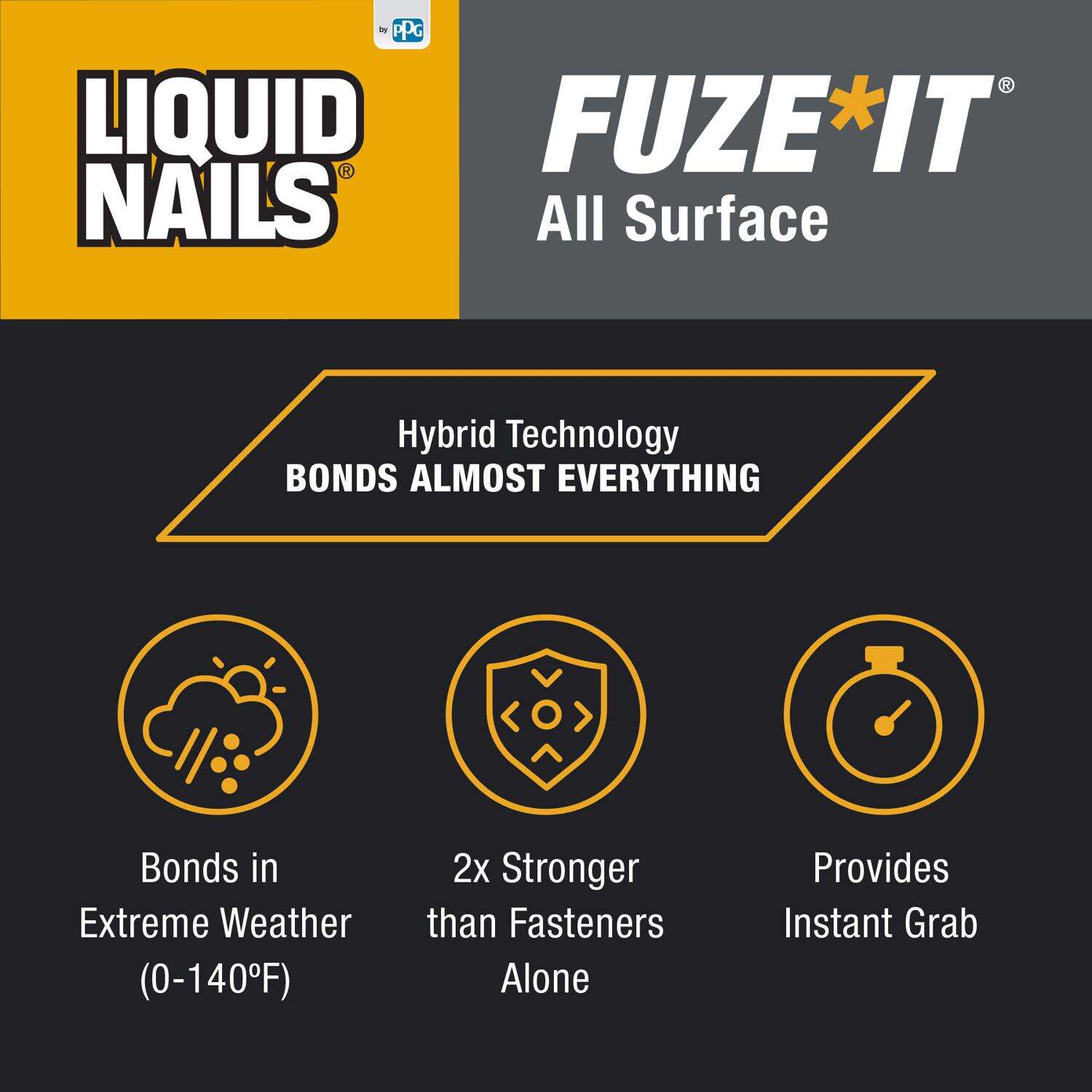 This construction adhesive is formulated with a proprietary hybrid-polymer blend for best-in-class adhesion. It bonds everything to everything (except polyethylene and polypropylene) and it bonds in any weather condition. Hot, cold, wet or dry, FUZE-IT All Surface offers a durable, flexible bond that is two times stronger than fasteners alone. Certified by UL Environment to meet the GREENGUARD GOLD Standard as a low emitting material.