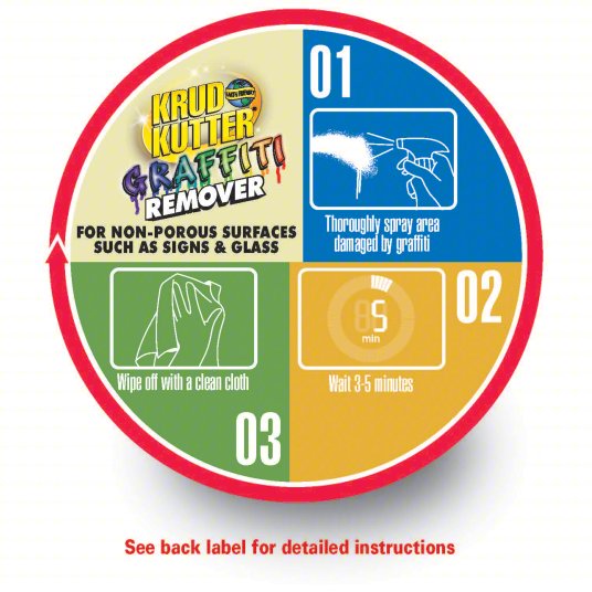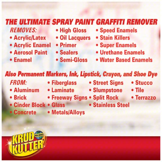 Krud Kutter Graffiti Remover removes aerosol paint, enamel, lacquers and more from most hard, soft or porous surfaces. Product provides a safe alternative to hazardous solvent-based removers. The ultimate spray paint graffiti remover is safe for use on clear coat automotive finishes.
