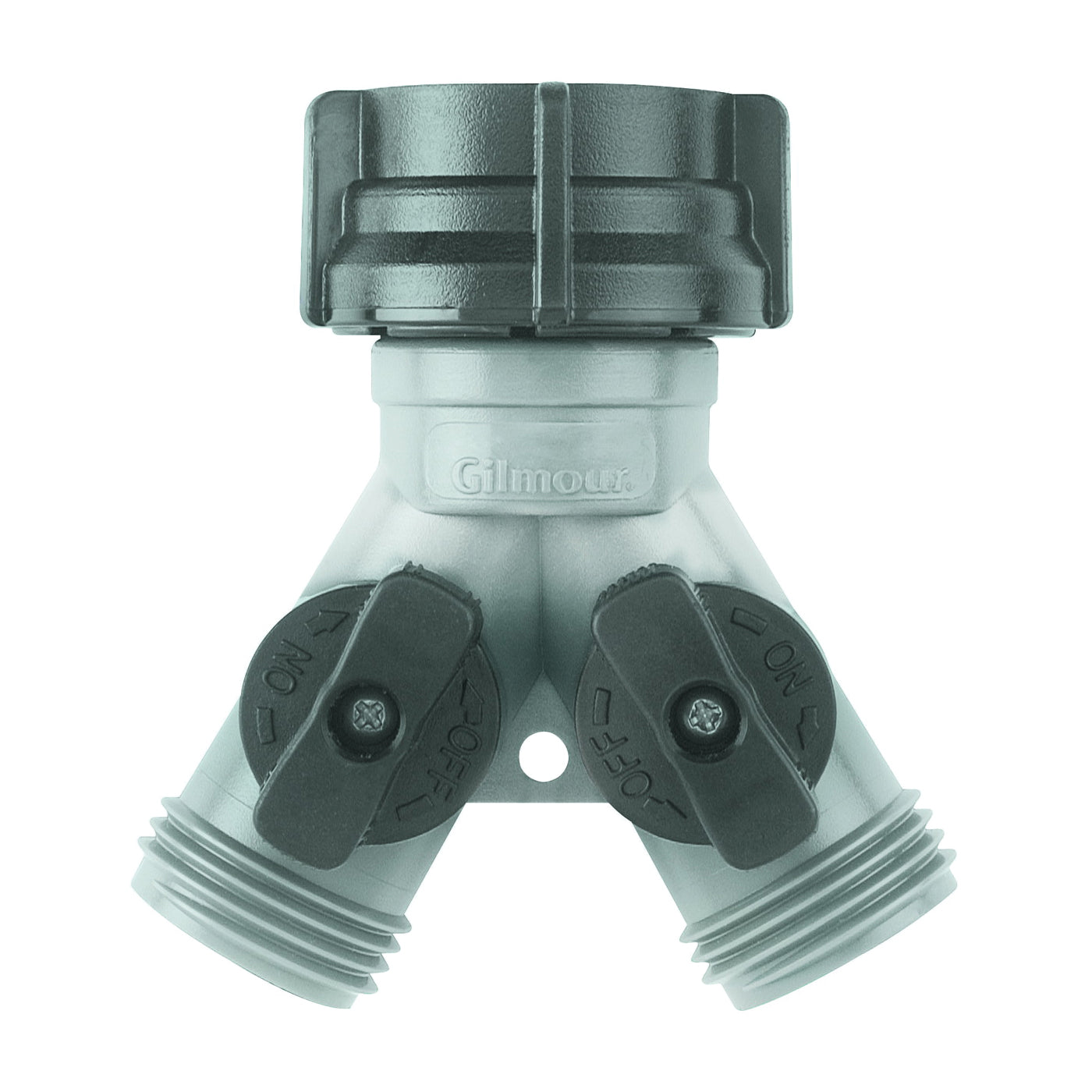 Send water to two destinations at once with the Gilmour Dual Shut-Off Valve Connector. Use it with sprinklers nozzles and more to efficiently water trees or a flower bed. The extra-large handles are easy to grip and turn so you can shut off one or both valves. This water flow valve also comes with a swivel connector that makes it easy to attach to a faucet.