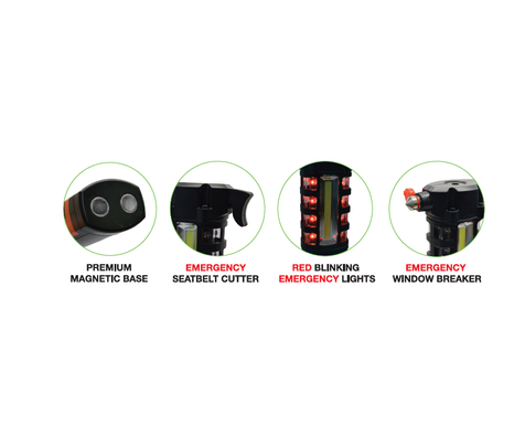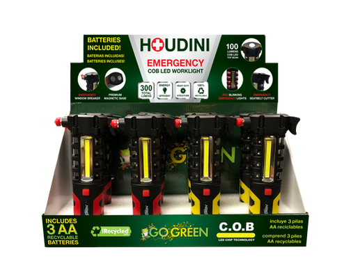 The Houdini has magically arrived to the GoGreen flashlight lineup. Its versatility makes it ideal for use in car emergency safety systems. Whether you want to achieve a DIY repair in your basement or simply need to illuminate a given area, this work light provides up to 300 total lumens to ensure you see every inch of your workspace. You can utilize a nifty top beam light (100 lumens) or use the side work light (200 lumens), depending on the situation.