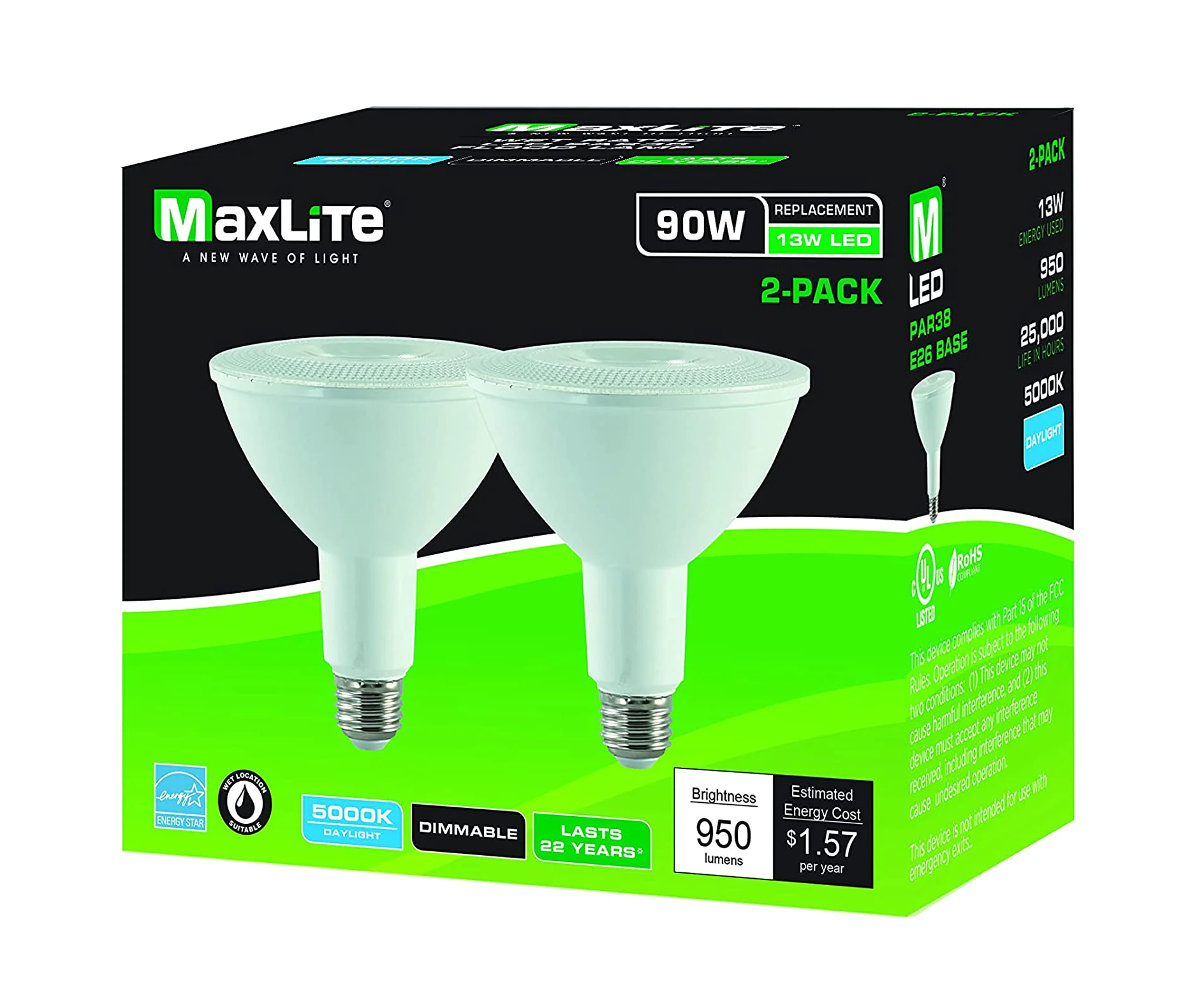 - 13W PAR38, 1050 lumens, replaces 100W Inc.