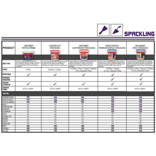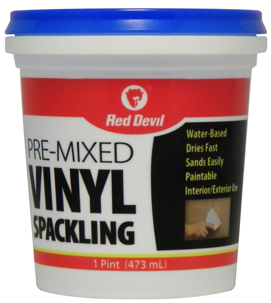Red Devil Pre-Mixed Vinyl Spackling is a general purpose, water-based vinyl spackling compound for patching holes and nail heads quickly and easily in plaster, wallboard, wood and stucco. It is specially formulated for easy application and sanding. It dries fast and holds tight providing a permanent repair. Can be used on both interior and exterior surfaces. Cleans up with water and paintable.