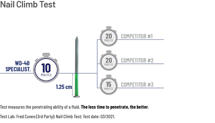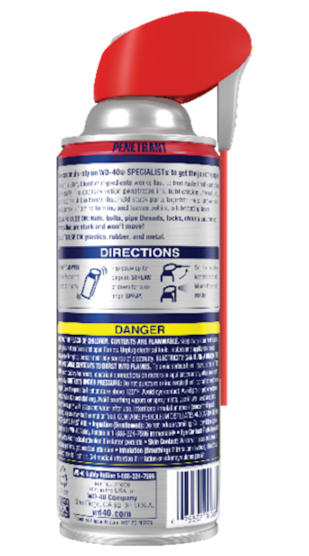WD-40 Specialist® Penetrant is a fast-acting penetrant with capillary action to penetrate deep into crevices, threads and seams to break the rust bonds that hold stuck parts together. It is a low odor formula that works on contact to free rusted nuts, bolts, threads, locks, and chains leaving behind a protective layer that prevents rust and corrosion from re-forming. It can also Spray 2 Ways®- up for stream and down for a wider spray.