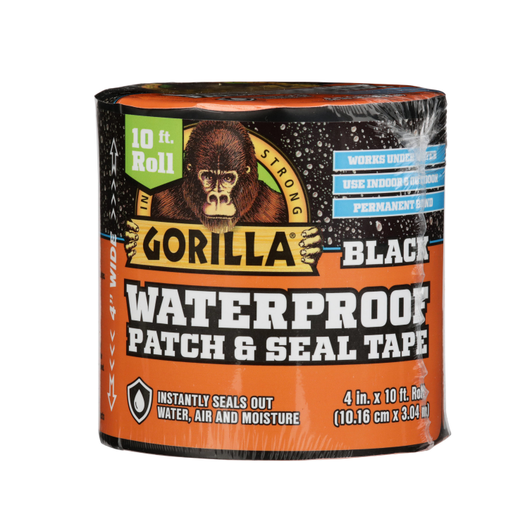Gorilla Waterproof Patch & Seal Tape instantly seals out water, air, and moisture. With an extra thick adhesive layer and UV resistant backing this tape conforms to form a permanent bond indoors and out. At 4" wide use it to patch holes, cracks, gaps and tears, even underwater. Excellent for Home, Auto, Marine, Camping, RVs, Outdoors, and more!